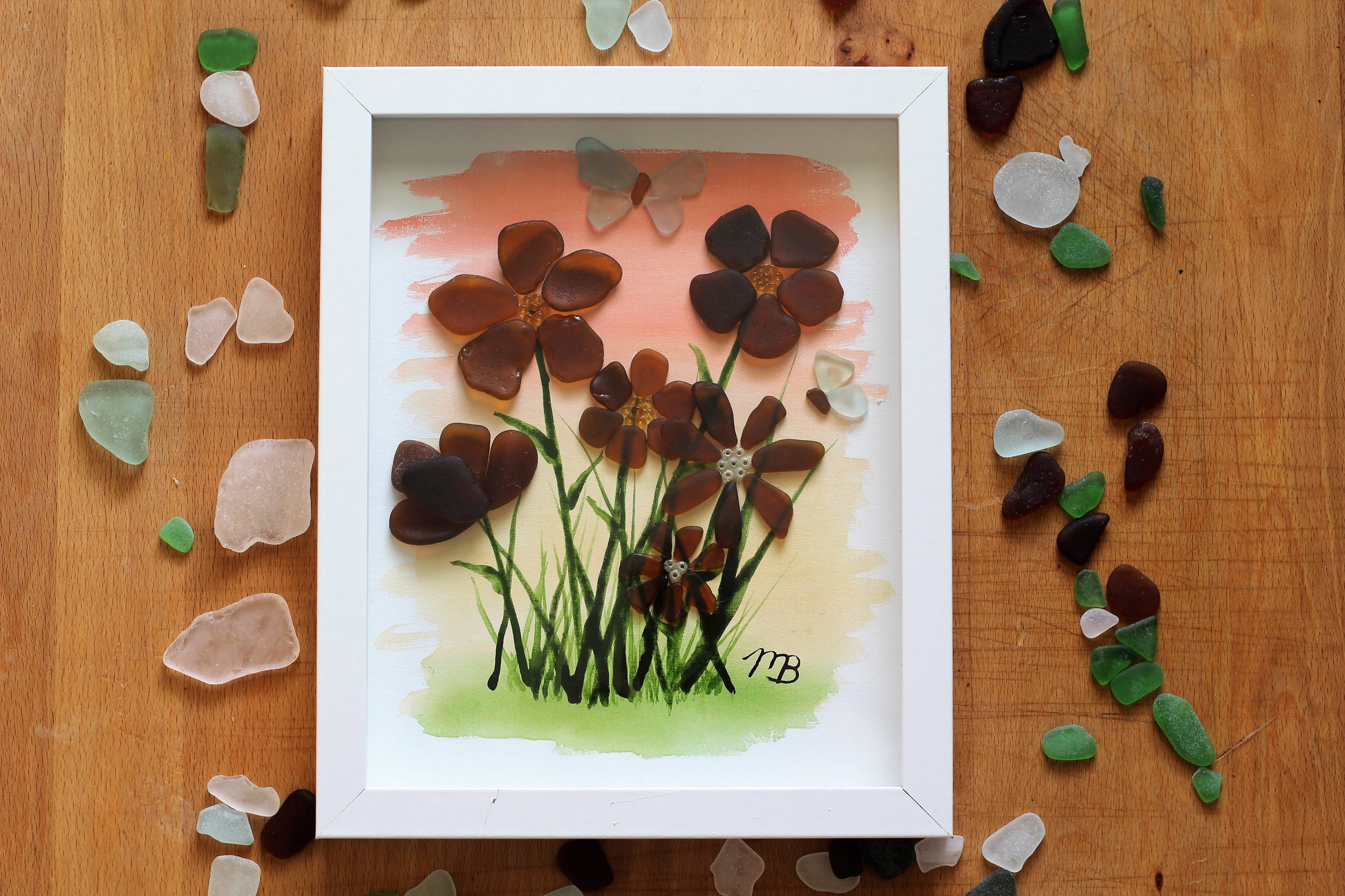This artwork is painted with professional grade watercolor paint on a canvas panel. All Sea Glass used in this piece was hand-foraged personally by the artist and her husband from the shores of the Bering Sea while they lived in Nome, Alaska. For paintings containing pebbles, they were also hand-foraged personally from the shores of Lake Michigan. Waxed cord and glass beads are also commonly used. Each item is attached to the canvas panel with industrial strength glue to ensure it stays secure.