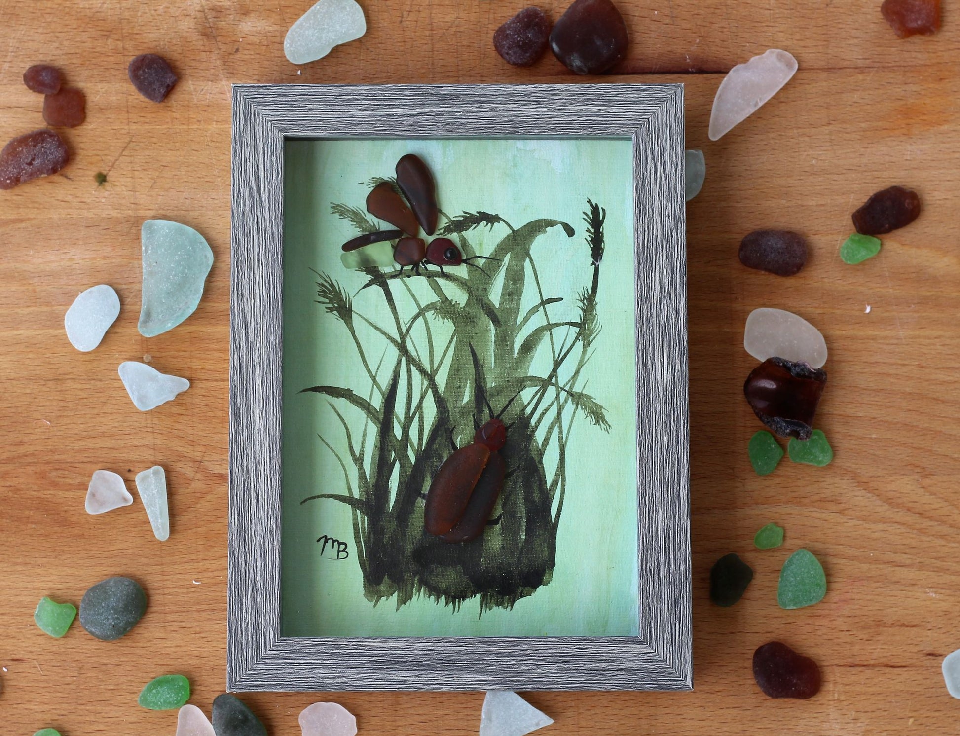 This piece contains brown Sea Glass, one glass bead, two RARE pieces of red Sea Glass, and one RARE pieces of uranium glass on the top firefly that glows under black light.