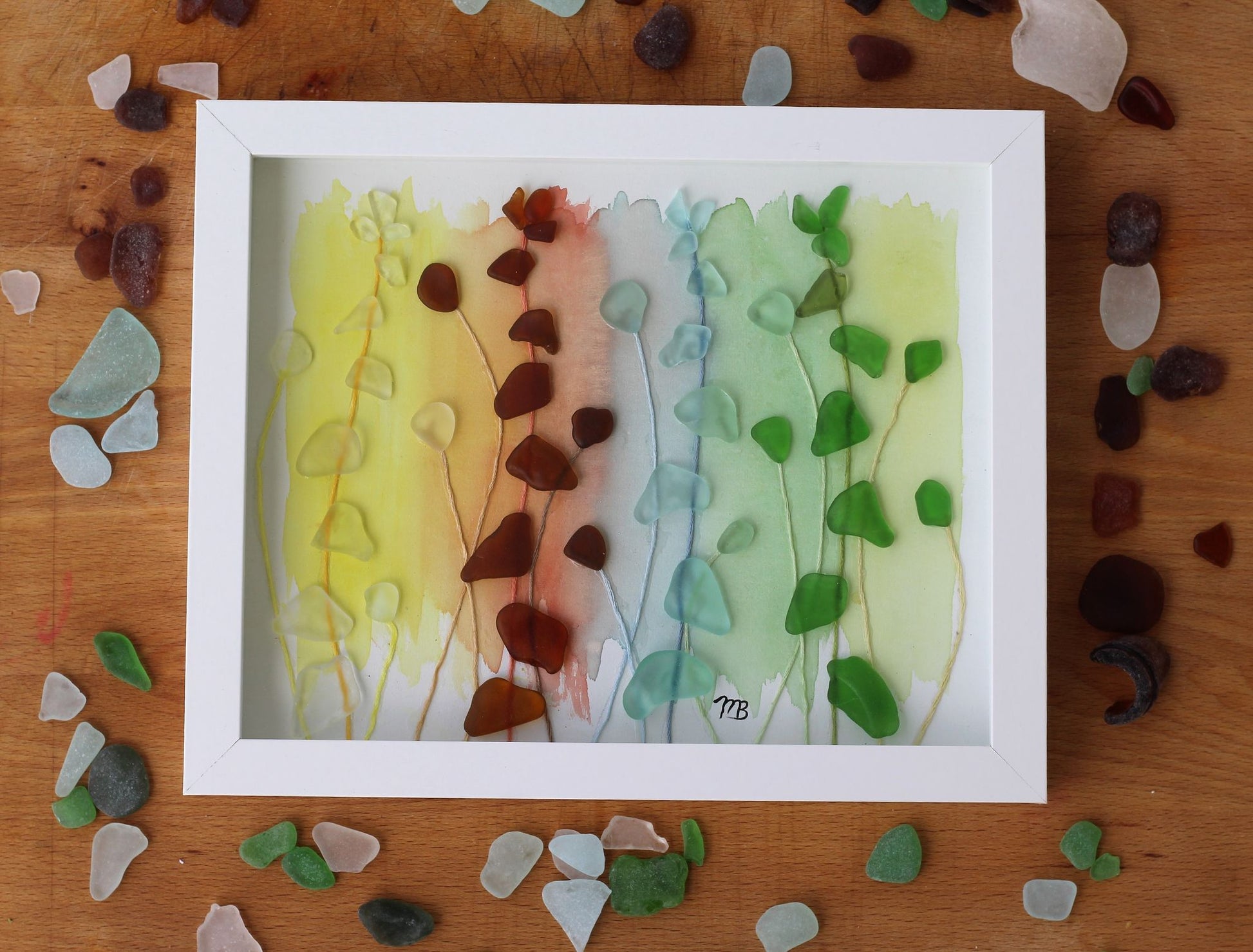 This artwork is painted with professional grade watercolor paint on a canvas panel. All Sea Glass used in this piece was hand-foraged personally by the artist and her husband from the shores of the Bering Sea while they lived in Nome, Alaska. For paintings containing pebbles, they were also hand-foraged personally from the shores of Lake Michigan. Waxed cord, embroidery thread, and glass beads are also commonly used. Each item is attached to the canvas panel with industrial strength glue to ensure it stays secure.