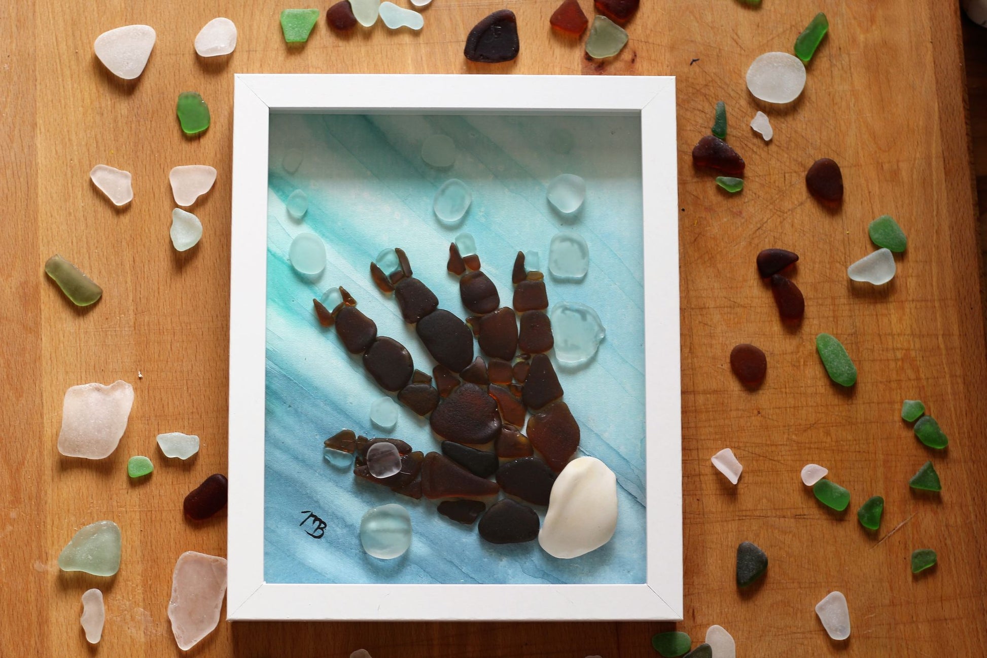 This artwork was meticulously crafted to resemble a hand, and contains a RARE porcelain piece of Sea Glass. It also contains brown and light blue Sea Glass.
