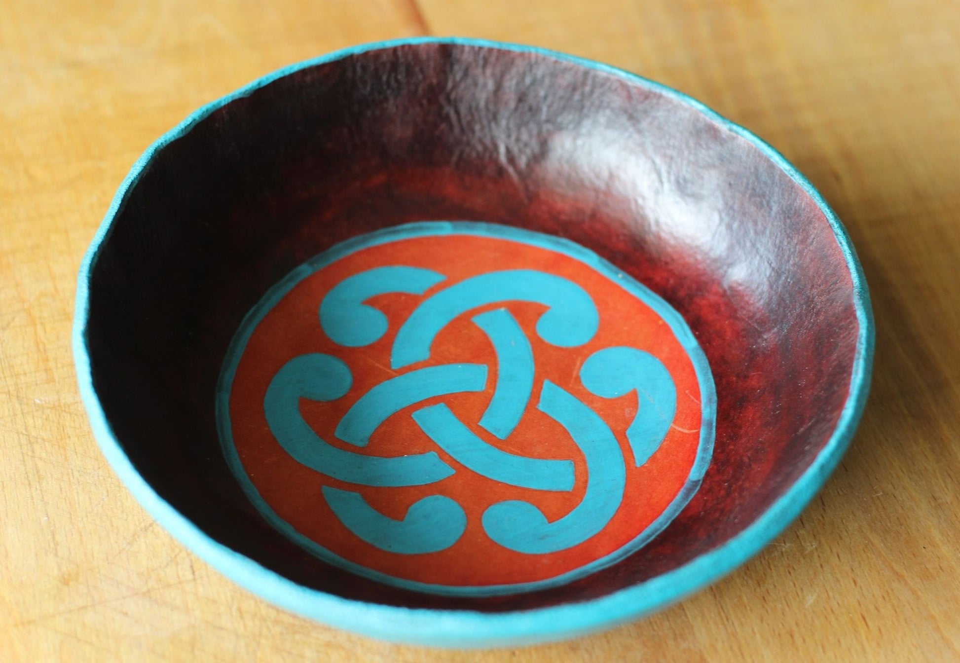 Genuine Leather Bowl made from one piece of leather, hand-molded into the form of a bowl, and hand-painted and hand-dyed with high quality leather paints and leather dyes.